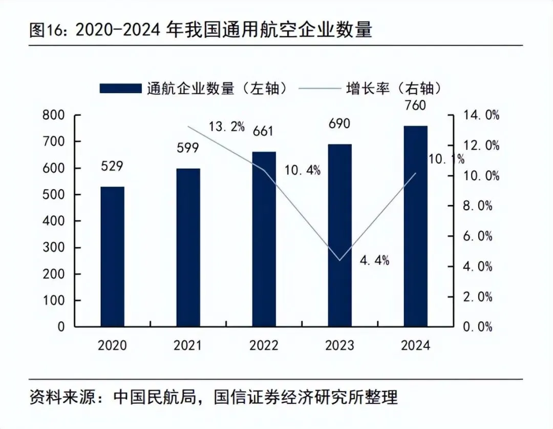 通航运营企业牌照门槛极高,具有重资产属性。通航运营为通用航空核心产业链中游,机场的设施及位置将影响通航运营的服务范围、航线数量和服务种类,加油点、通讯设施、合格停机坪的位置及数量将影响通航运营企业的服务能力和服务安全性,进而影响下游需求。通用航空各类业务差异明显、作业环境复杂、作业量较大,对生产安全提出较高要求,存在较高的技术管理和运行资质壁垒。安全保障能力是通用航空企业的核心关注点,为有效保证飞行的安全性、可靠性,通用航空公司飞行员均需经过长时间培训和实操经验,并取得相应的专业技术资格。此外,通用航空行业作业范围广、作业空域低、作业时效性强,对于通用航空公司航空器检修、运行监控、保障服务都提出了极高的要求。经营运行资质的取得需要企业在技术水平、机队规模、人员完整度、运营管理水平等多方面达到相应标准,通过民航局相关批准,方可取得。海上油气平台飞行服务、海上风电飞行服务、直升机代管及公共服务等通航业务具有较高资金、安全、技术门槛。通航企业承接该类业务,需在安全保障、基础设施、人员训练等方面有较大投入,满足甲方及监督方要求。例如,从事海上油气平台飞行业务,必须拥有先进的大中型直升机,以及配套的通航机场、机库等基础保障设施,该特点决定了该类业务的重资产属性。 国内多数通航运营企业规模小,主要业务集中于少数龙头企业。我国通航运营企业以培训业务和农林作业类业务为主,高附加值的个人消费服务(载客类)在2024年仅占比 1.78%。根据中国民航局数据,截至 2024 年底,我国获得通用航空经营许可证的传统通用航空企业 760 家,企业平均航空器持有量仅为4.25 架,多数企业规模不大、飞行量较少。全国约有 80%以上的通航企业规模小,处于起步阶段,盈利能力较弱,而少数规模较大的通航企业凭借技术资源、人才资源、航线资源等优势,市场占有率较高,盈利能力较强。目前市场主要参与者多为大型国有企业,如中信海直、南航通航、中国通航、北大荒通用航空等。呈现出区域性和细分赛道特性。