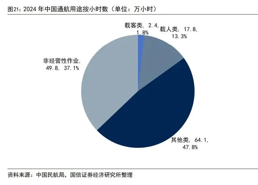 我国当前通航飞行用途以传统作业场景和飞行培训场景为主,载人载客类等消费类应用发展潜力大。2024 中国年通航飞行小时数为134.1 万小时,同比下降2.2%。按用途划分,其他类(传统作业)完成 64.1 万小时,同比降8.0%,占总小时数47.8%;非经营性作业(培训类)完成 49.8 万小时,同比降0.6%,占总小时数37.1%;飞行载客运输类(从事旅客运输的经营性飞行服务活动)飞行2.4 万小时,同比降 12.5%,占总小时数 1.8%;载人类(空中游览、文旅观光等)完成17.8万小时,同比增 22.6%,占总小时数的 13.3%。