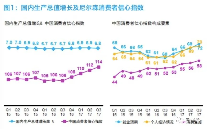 2017年中国整体经济稳定健康发展,GDP稳定在6.8%-6.9%。尼尔森消费者信心指数从2016年第四季度开始稳定上升,在2017年第三季度达到114,创三年来历史新高。消费意愿持续攀升,支撑了消费品市场的增速反弹。