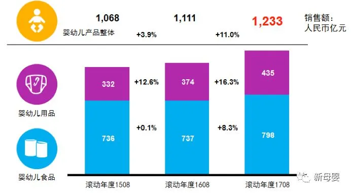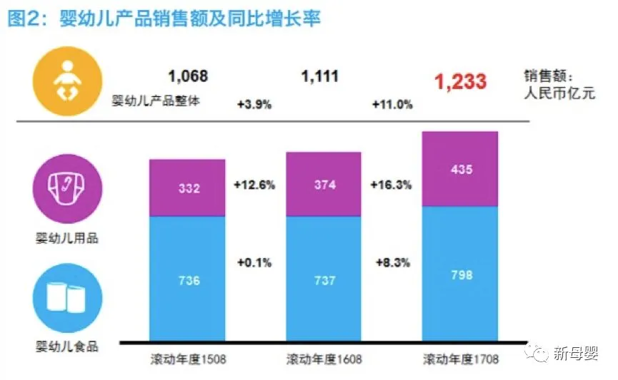 在经济环境稳定,消费意愿提升,以及二孩政策的全面落实的利好下,婴幼儿市场亦呈现整体回暖趋势。2017年尼尔森监测的婴幼儿行业(定义详见附录) 销售额达到1,233亿元(2016年9月至2017年8月),增长率达到11.0%,较去年3.9%的增幅有大幅的提升。婴幼儿用品市场引领整体市场增幅,销售额增长率达16.3%,而体量占整体销售额比重64%的婴幼儿食品品类也达到了8.3%的增幅。