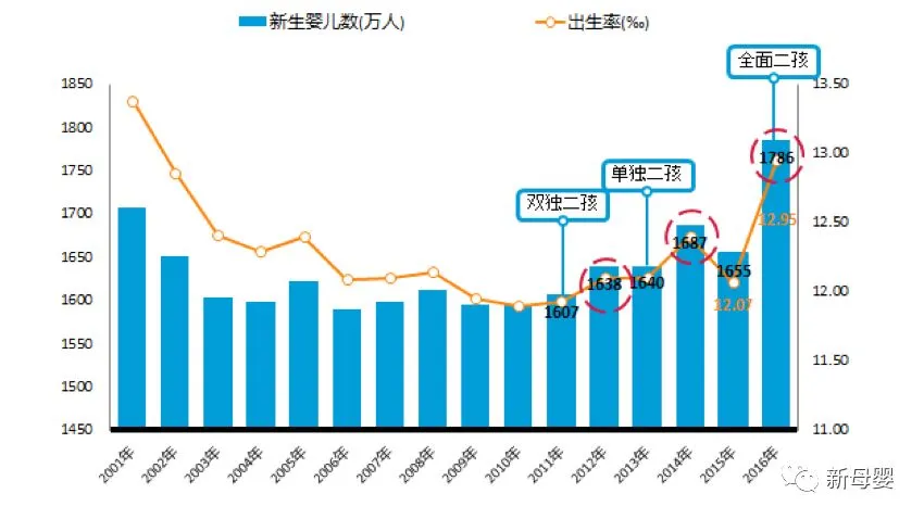 随着二孩政策的不断开放,政府对二孩宣传力度的加深,2016年人口出生率显著提高。根据统计局公布的数据,2016年新生婴儿数达1786万,超过预期的1750万,净增131万人,增幅达7.9%,相比之前推出的双独二孩和单独二孩政策,全面二孩带来了更为显著的人口增幅。