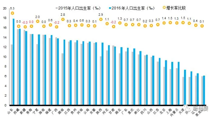对比各省市的2015和2016两年的人口出生率可以看到,山东,陕西,湖南人口出率上升最多,分别增加5.3,2.9和2.8个点。其中山东省人口出生率受二孩政策刺激最为明显,2016年出生率已经超过西藏,达到17.89‰,从2015年的13位上升至2016 年第一位。