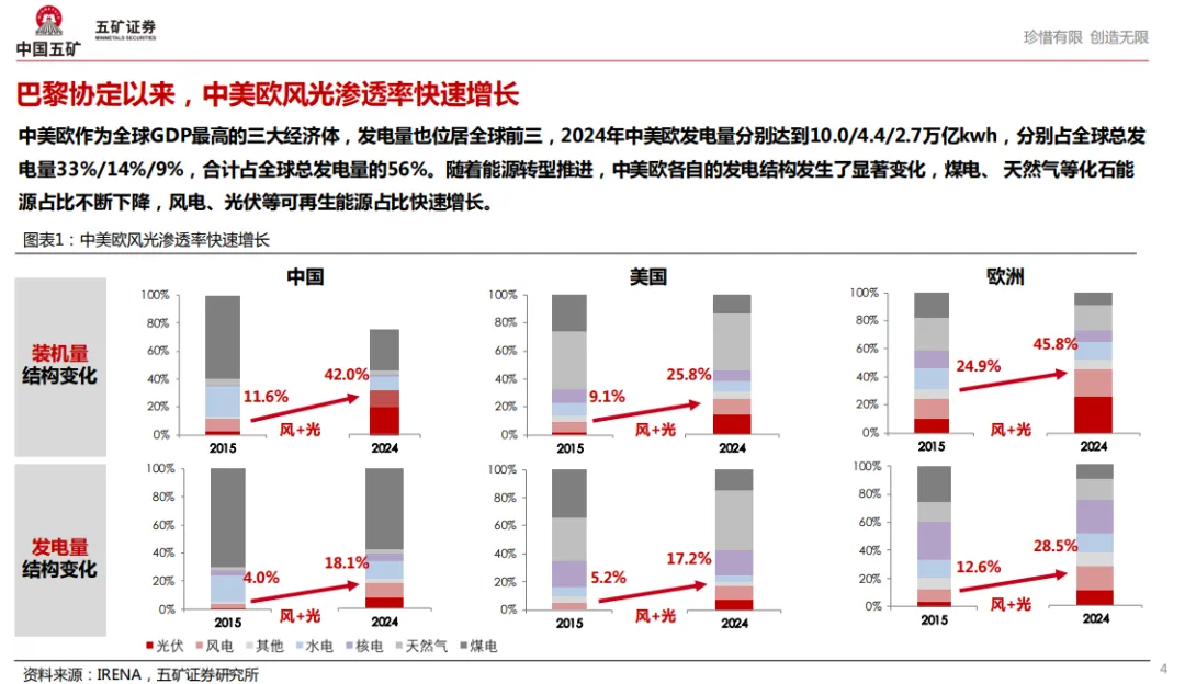 巴黎协定以来,中美欧风光渗透率快速增长