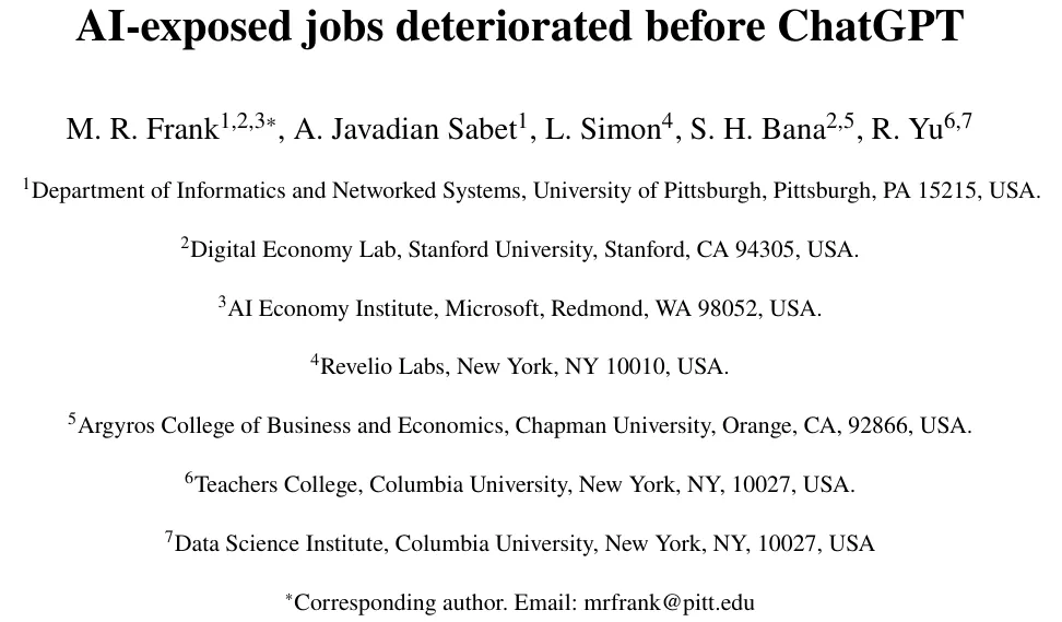 来自匹兹堡大学、斯坦福大学、微软AI经济研究所等机构的研究团队发布了一项重磅研究。