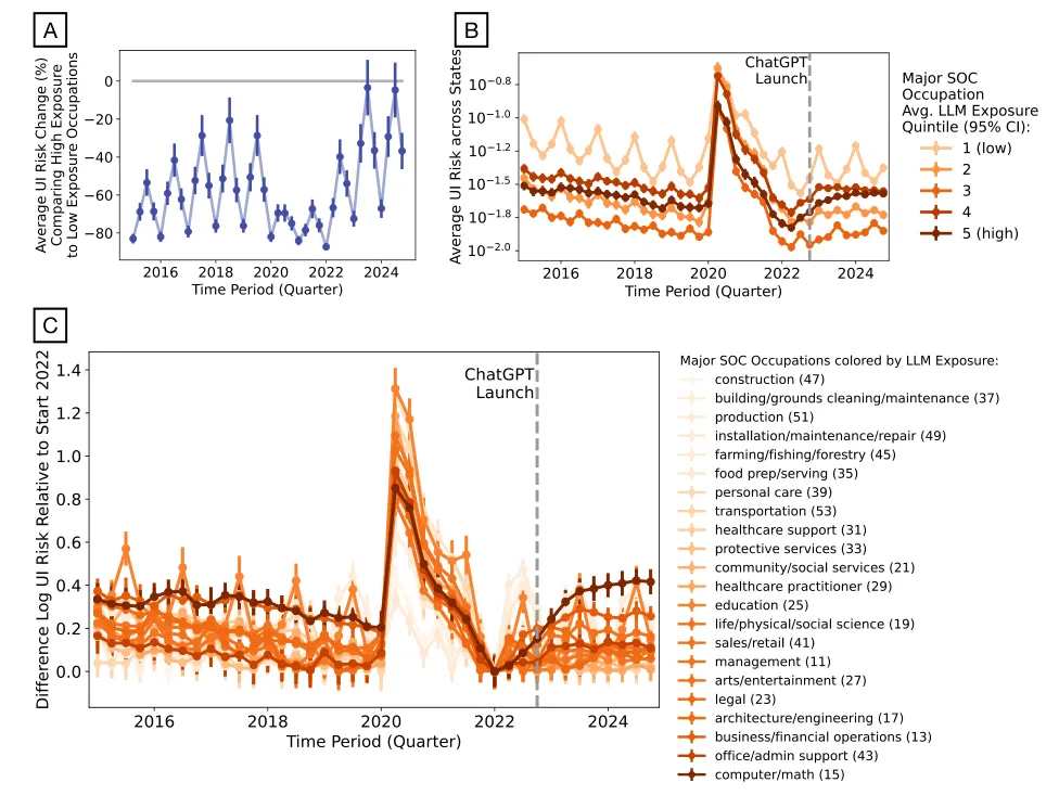 早在ChatGPT于2022年11月发布之前的几个月,高暴露职业的失业风险就开始显著上升。