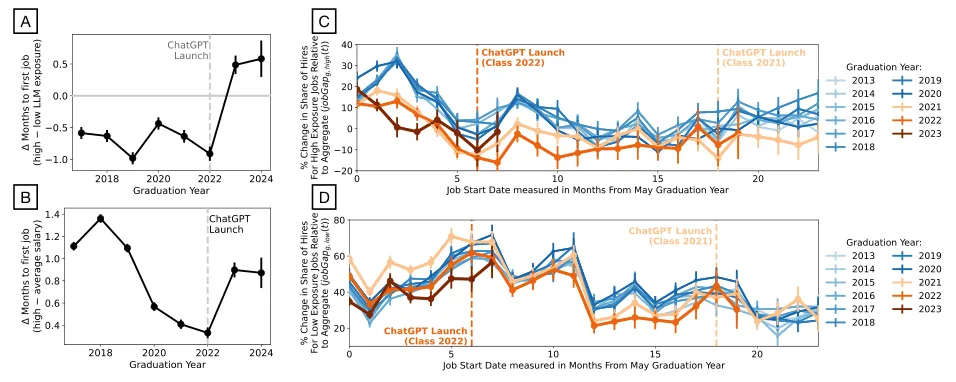 在图A中,我们看到在ChatGPT发布之前,那些最终进入高AI暴露职位的毕业生,通常比同届其他同学花更少的时间就能找到工作。
