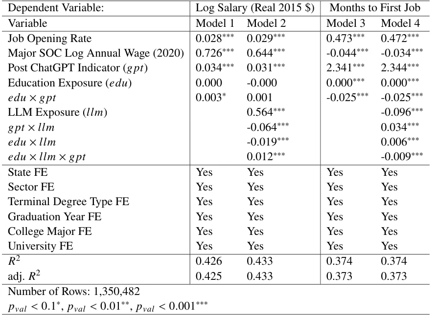 模型显示,教育暴露度(*edu*)与ChatGPT时期(*gpt*)的交互项在薪资预测中系数为正,在求职时间预测中系数为负。