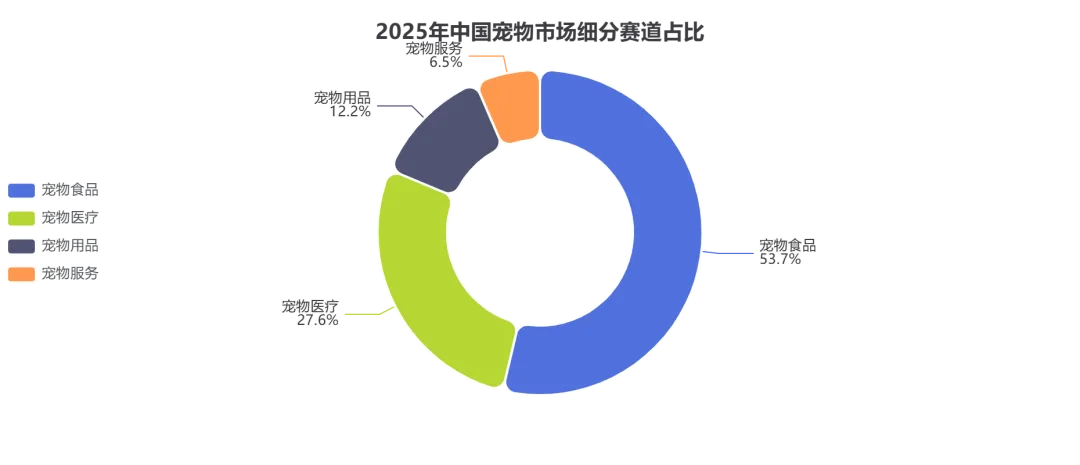中国宠物市场由四大细分赛道构成:宠物食品、宠物医疗、宠物用品、宠物服务。各赛道规模、增速和发展阶段各异,呈现出差异化的投资机会。