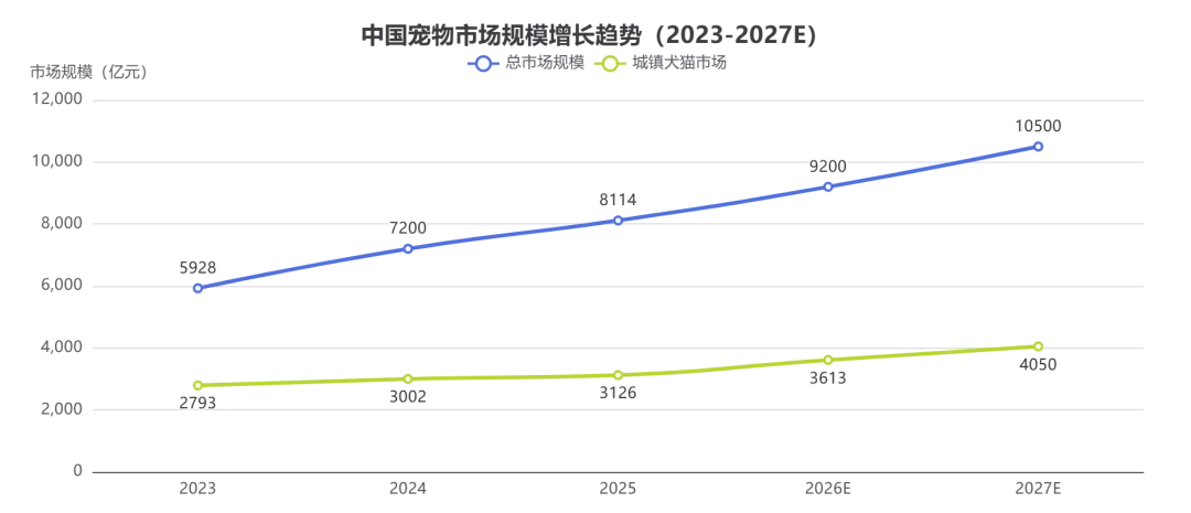 预测数据显示,到2027年城镇犬猫市场规模将突破4000亿元,达到4050亿元[2],到2028年有望进一步扩容。这意味着未来三年,宠物市场仍将保持双位数增长。