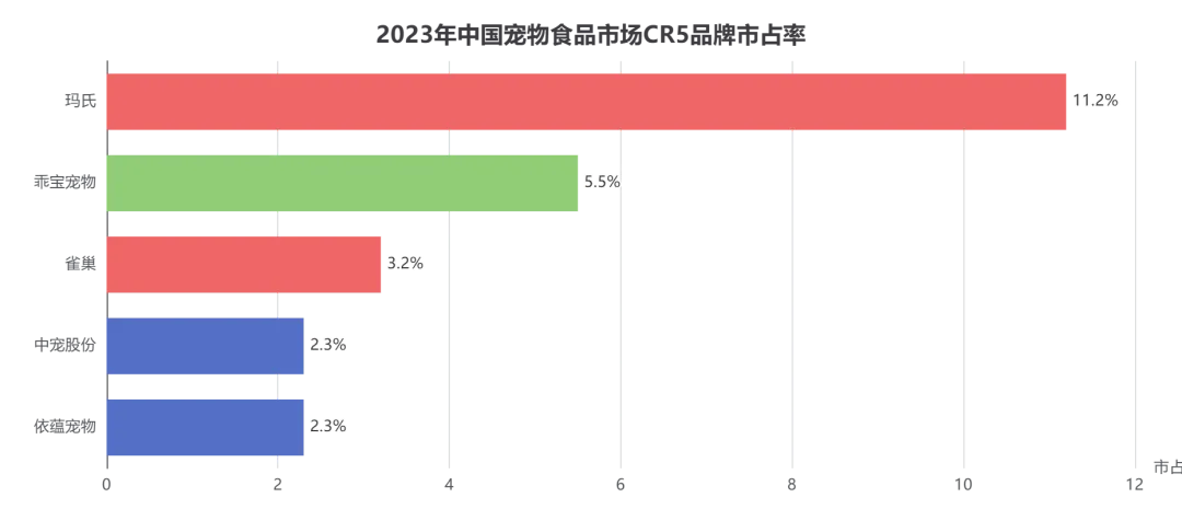 雀巢(Nestlé):旗下冠能(Pro Plan)等品牌,2023年市占率3.2%[12],较2014年的5.9%下滑明显[14]。