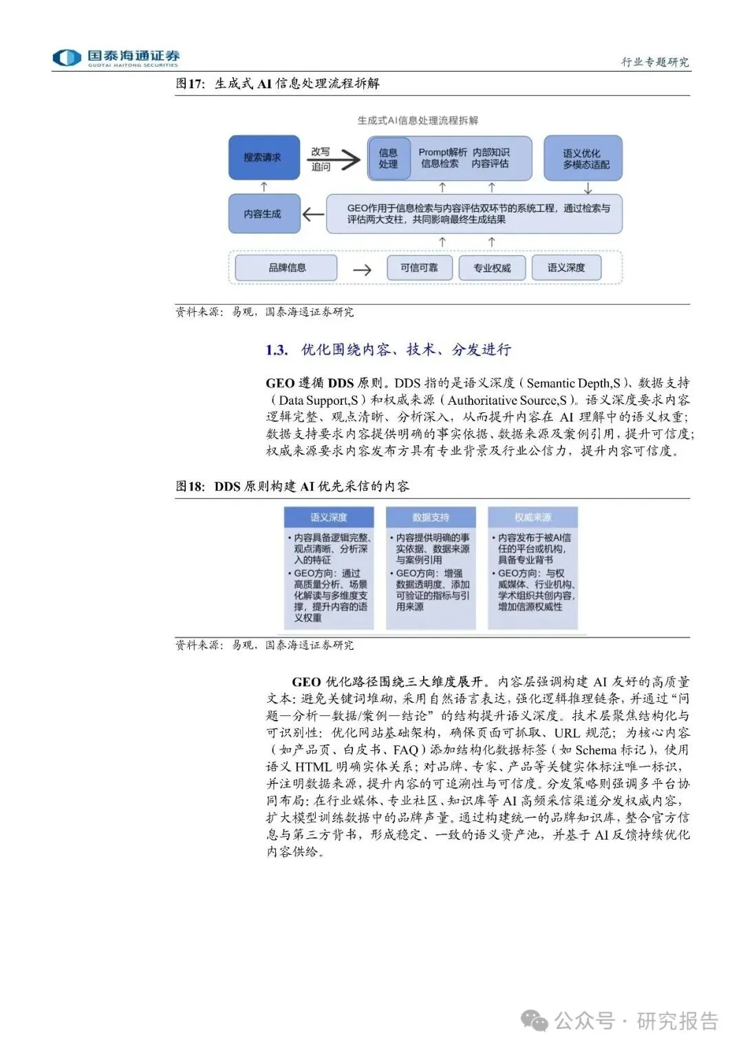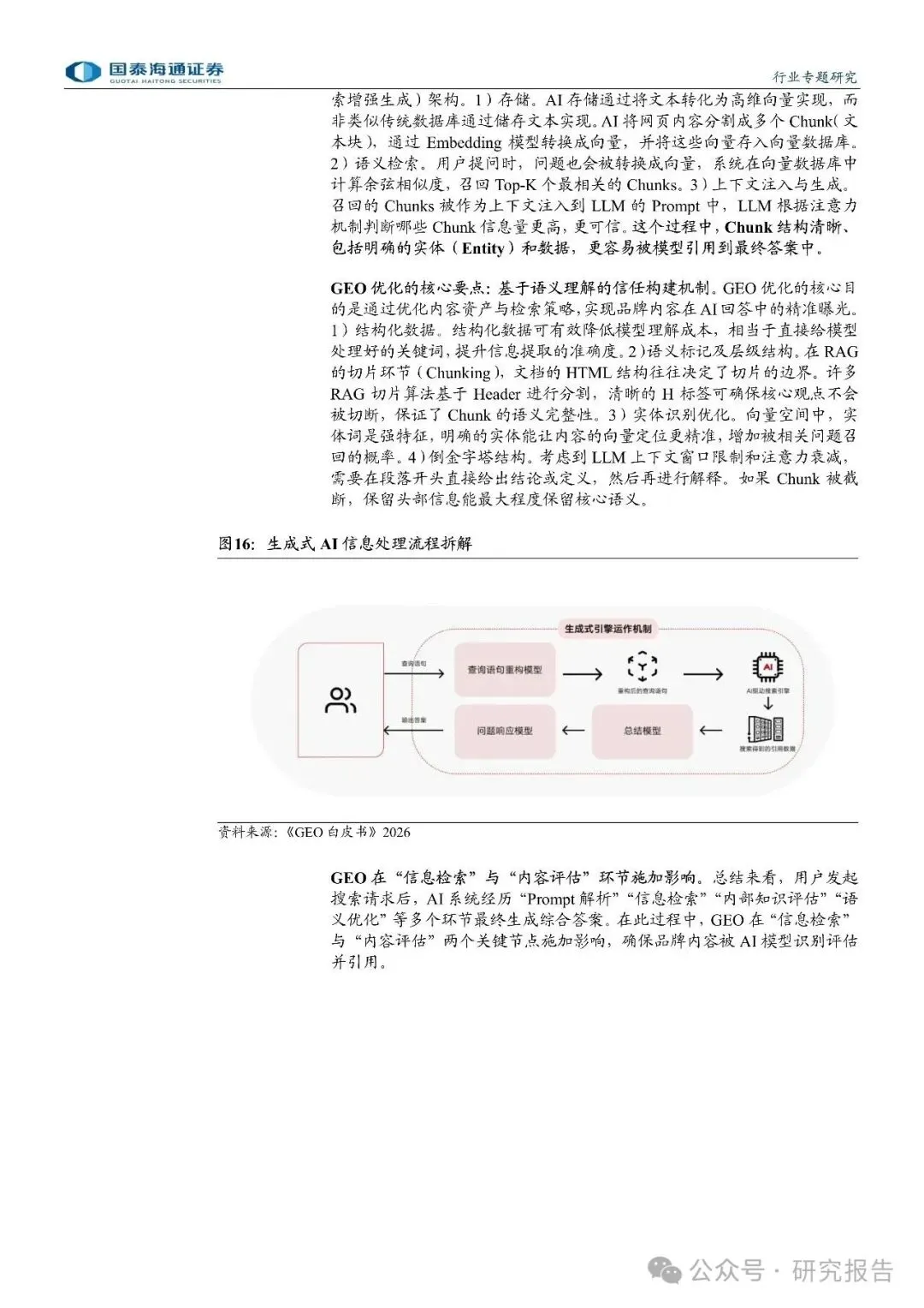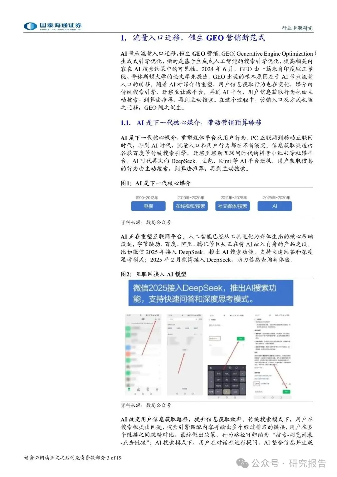 AI带来流量入口迁移,催生 GEO 营销。GEO 出现的根本原因在于AI 带来流量入口的转移,从而营销入口及方式也随之迁移。PC 互联网到移动互联网,再到 AI 时代,流量入口和用户行为都在不断演变。用户信息获取渠道由谷歌百度等传统搜索引擎,迁移至抖音小红书等社媒平台,再到 DeepSeek、豆包、Kimi 等 AI 平台。搜索框不再是通往网页列表的入口,而是通往即时知识合成的界面。营销角度自然希望品牌和内容能在生成式引擎的对话结果中露出,GEO随之诞生。