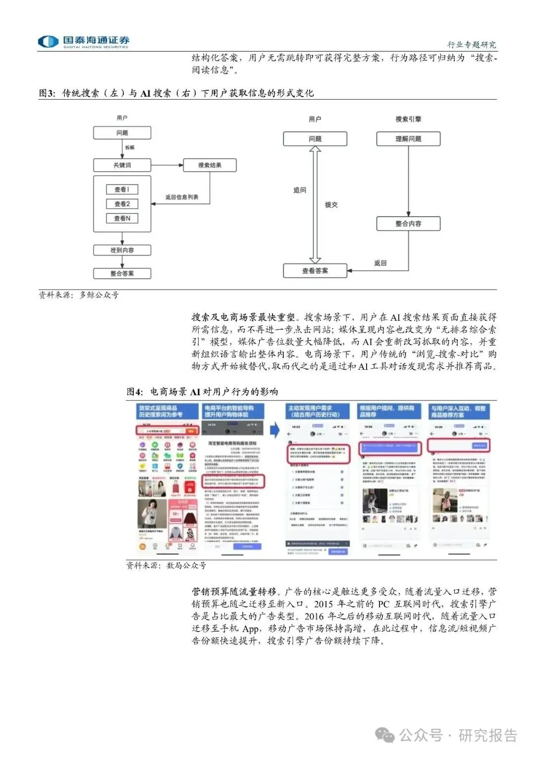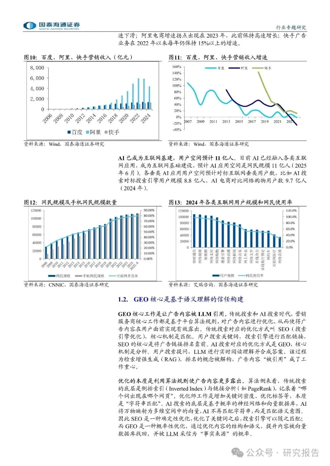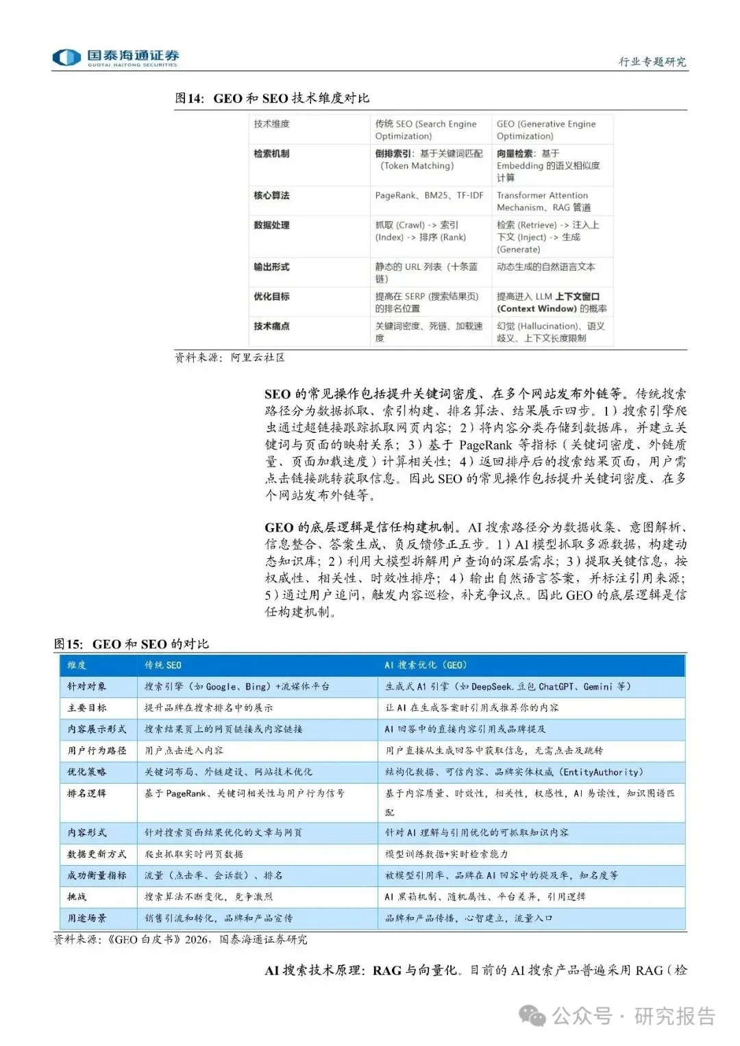AI带来流量入口迁移,催生 GEO 营销。GEO 出现的根本原因在于AI 带来流量入口的转移,从而营销入口及方式也随之迁移。PC 互联网到移动互联网,再到 AI 时代,流量入口和用户行为都在不断演变。用户信息获取渠道由谷歌百度等传统搜索引擎,迁移至抖音小红书等社媒平台,再到 DeepSeek、豆包、Kimi 等 AI 平台。搜索框不再是通往网页列表的入口,而是通往即时知识合成的界面。营销角度自然希望品牌和内容能在生成式引擎的对话结果中露出,GEO随之诞生。