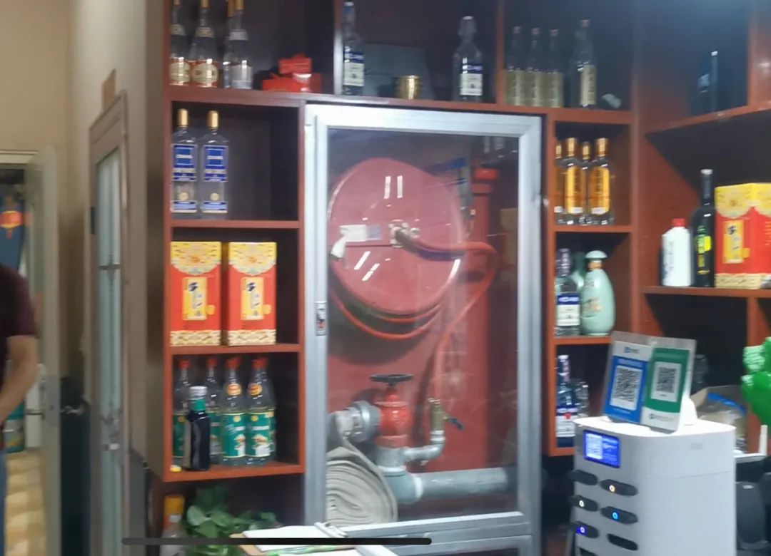 存在隐患:1、场所二层东侧安全出口处常闭式防火门未安装闭门器;2、一层吧台处消火栓无标识。