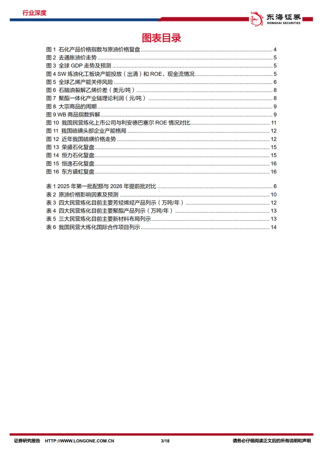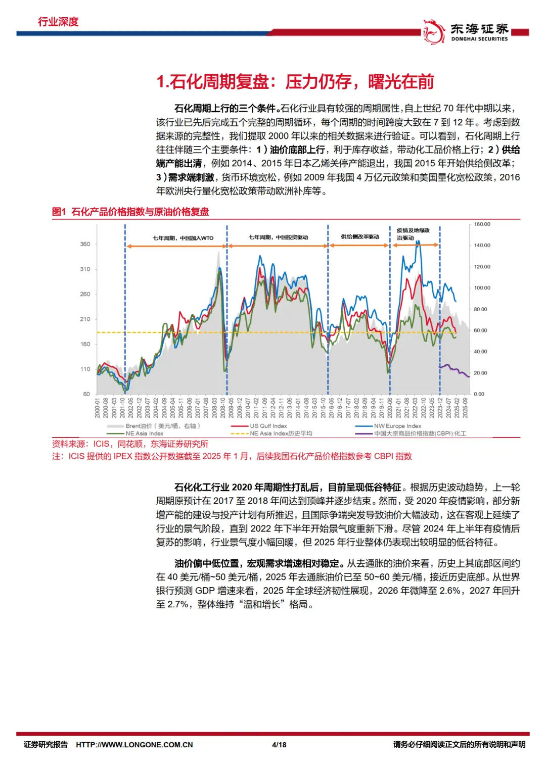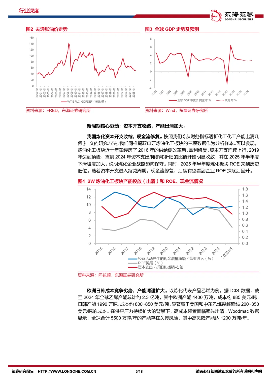 报告首先复盘石化周期,指出行业上行需满足油价底部上行、供给端产能出清、需求端货币宽松三大条件。2025 年去通胀油价已至 50-60 美元 / 桶的历史底部区间,全球 GDP 将在 2026-2027 年温和增长。当前核心驱动在于资本开支收缩与产能出清,我国炼化企业 2024 年资本支出占比开始收敛,欧洲日韩高成本产能加速退出,行业 ROE 有望探底回升。————