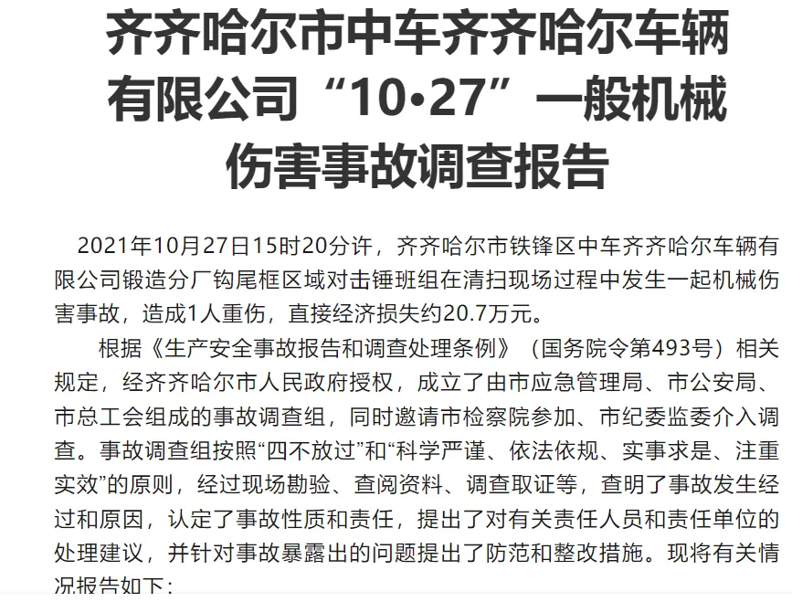 齐齐哈尔市中车齐齐哈尔车辆有限公司“10·27”一般机械伤害事故调查报告
