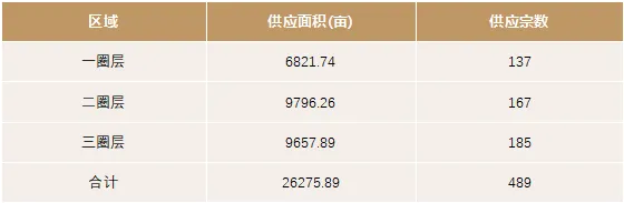 从区域看,供应面积以二圈层最多,为9796.26亩,占总供应面积的37.28%;供应宗数则为三圈层最多,占总供应宗数的37.83% 。具体情况如下: