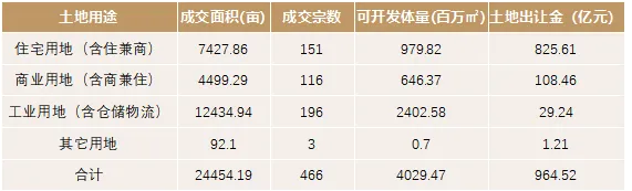从土地用途看,成交面积以工业(含仓储物流)用地为主,为12434.94亩,占总成交面积的50.85%;而土地出让金则以住宅(含住宅兼容商业)用地为主,揽金825.61亿元,占全年土地出让金收入的85.60%。