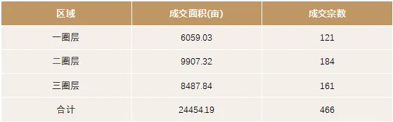 从区域看,二圈层为本年度主力,以9907.31亩、184宗的成交位列各区域榜首,分别占总成交面积、总成交宗数的40.51% 、39.48%。 具体情况如下: