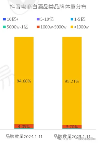 2024年1-11月GMV在1000万量级以下的白酒品牌数量占比缩减,向上成长为1000-5000万量级;