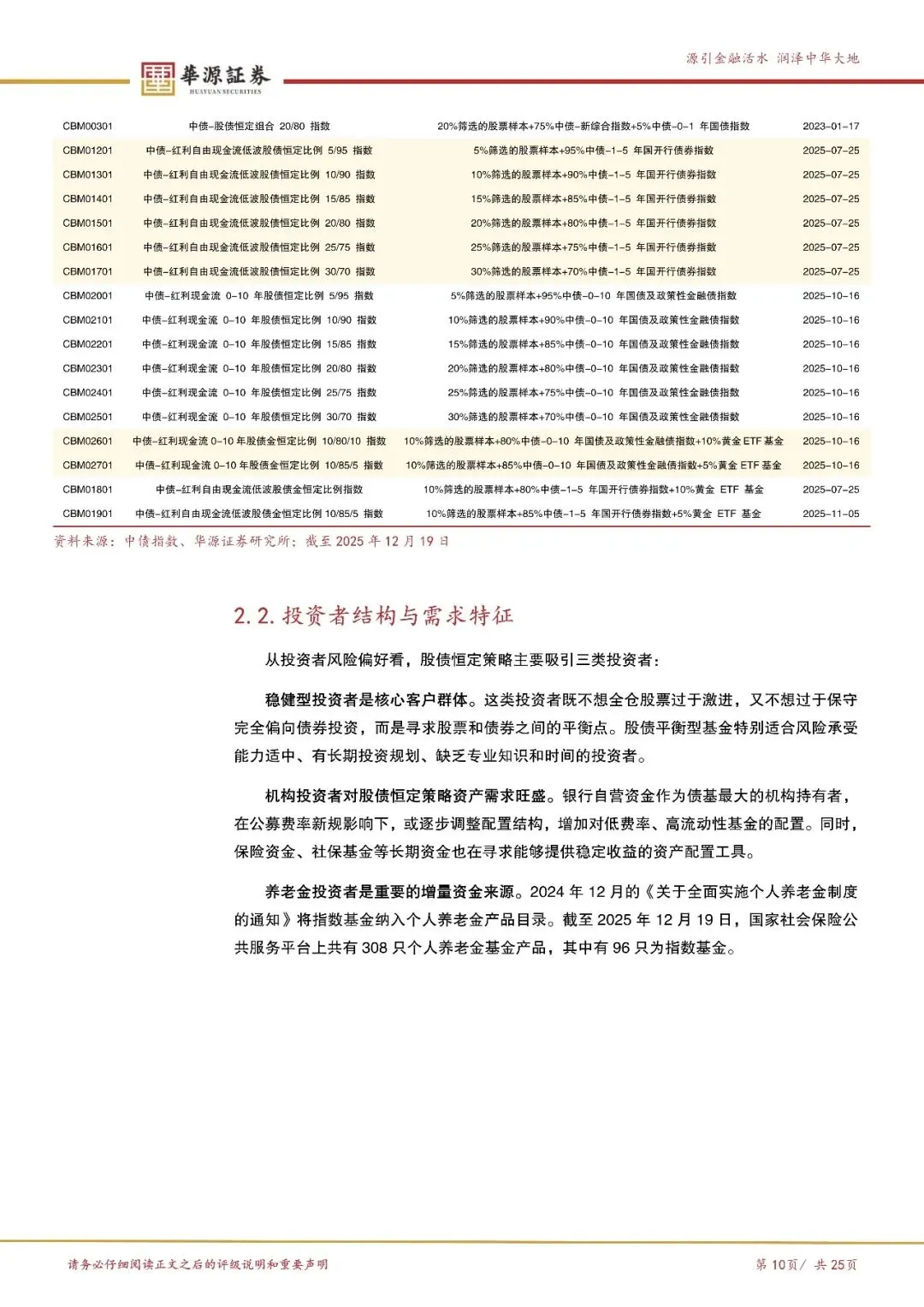国内处于起步阶段,受指数体系与政策双轮驱动,未来发展或较快。国内股债恒定策略起步较晚但发展迅猛,中证指数2012年开启探索,2025年成为关键节点:证监会印发《促进资本市场指数化投资高质量发展行动方案》,中证与中债密集发布近50只股债恒定指数,初步形成多元指数体系。投资者端,个人人养老金等长期资金对稳定收益产品的需求或较为迫切,股债恒定指数基金或成为重要配置标的。市场供需两旺与政策支持共同推动行业快速发展。