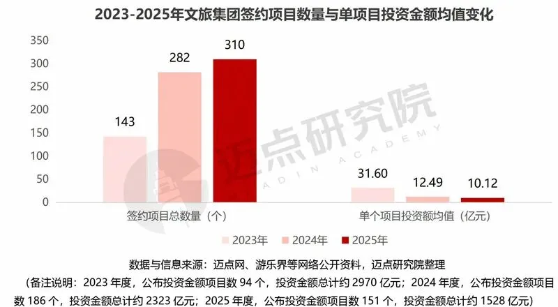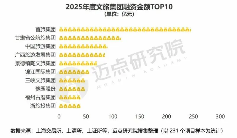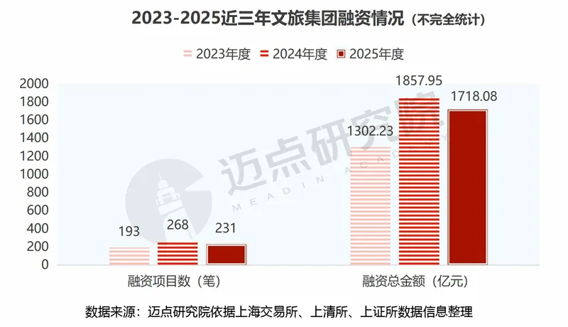 据迈点研究院不完全统计,2025年度各文旅集团完成231笔融资项目,合计金额1718.08亿元。通过近三年数据对比分析,2025年文旅集团融资呈现阶段性调整特征:融资项目数较2024年虽有所回落但仍高于2023年,融资总金额虽较2024年略有下降但仍远高于2023年;单项目平均融资额有所提升,反映资金向优质头部项目集中,整体来看文旅集团融资仍维持高位活跃状态,同时从快速扩张向理性化、高质量方向转型。