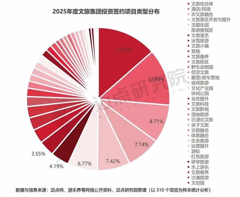 投资签约项目类型分析,文旅综合体、酒店民宿、农文旅融合、文旅景区开发与提升、主题乐园、旅游度假区、文旅演艺、冰雪旅游为主导,筑牢文旅产业发展根基;以文旅康养、低空文旅、营地、夜间旅游、文旅科技、影视文旅、亲子文旅、游轮等多元业态为重要补充,拓展文旅消费新场景、新赛道;多元文旅项目供给为文旅消费市场提质扩容提供坚实支撑。