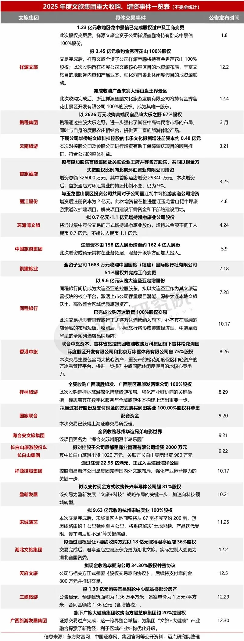 2025年,文旅行业资本市场活跃度显著提升、资本运作频繁,复星旅文私有化退市、张旅集团加快重整步伐,香港中旅、同程旅行接连完成并购布局,湖北文旅集团入主君亭酒店,印象大红袍、陕西旅游稳步推进资本化进程(已分别于2025年12月22日在港交所上市、2026年1月6日上交所上市),广西旅发集团年底跨界控股收购国货品牌“南方黑芝麻”……一系列多元资本操作,凸显出国资成为文旅资本舞台核心玩家、行业整合从单一领域向跨界融合延伸,将进一步重塑文旅行业的竞争格局。