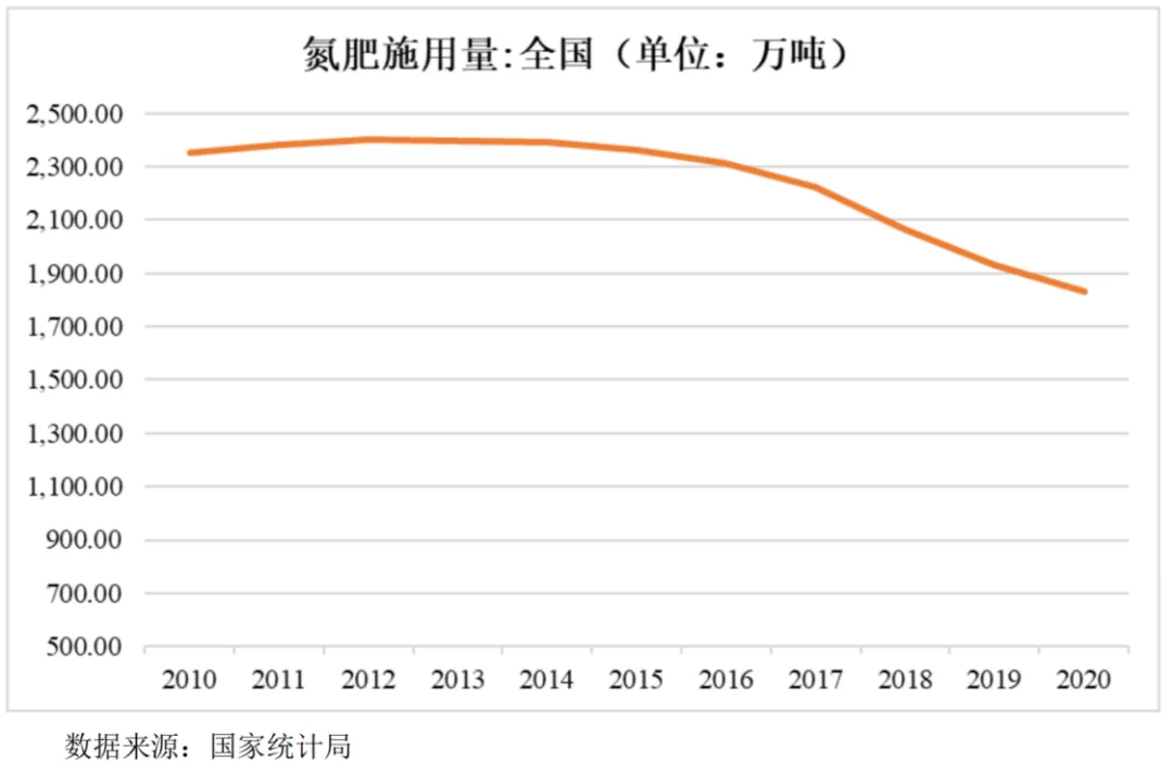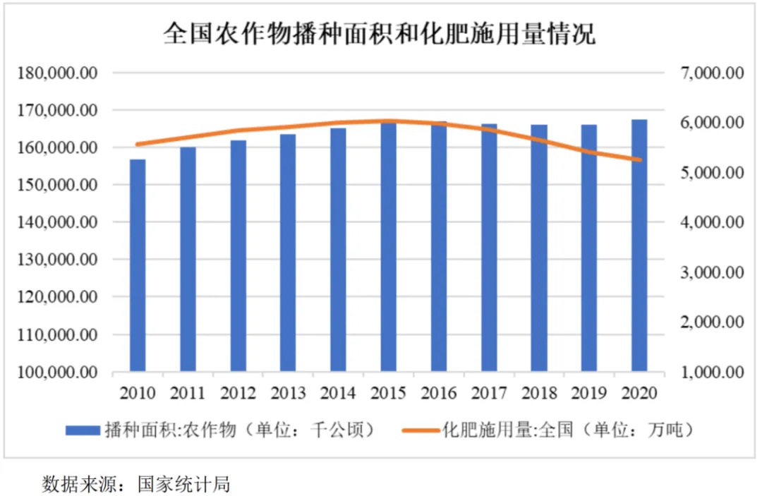 化肥指利用化学和(或)物理方法制成的含有一种或多种农作物生长所需营养元素的肥料,又称无机肥料。化肥具有养分含量高,施用量少的特点,同时肥效快,大多数易溶于水,能很快被农作物吸收利用。依据所含营养元素的数量不同,常见的化肥可分为单质肥料和复合肥料两类:(1)单质肥料是仅含一种可标明含量的营养元素的化肥,又称单质肥,常见的单元肥料包含氮肥、磷肥、钾肥:①氮肥具有促进植物光合作用、提高作物产量的功效,主要产品有尿素、碳酸氢铵、硝酸铵、氯化铵等;②磷肥具有促进作物分蘖、催熟功效,主要产品有磷酸一铵、磷酸二铵、硝酸磷等;③钾肥具有促进植物体内酶的活化功效,使作物具备抗倒伏、抗寒、抗旱、抗病虫害等特点,主要产品有氯化钾、硫酸钾等;(2)复合肥料是含有氮、磷、钾三种营养元素中的两种及以上且可标明含量的化肥,又称复混肥料。复合肥料是含有氮、磷、钾三种营养元素中的两种及以上且可标明含量的化肥。复合肥产品可同时提供多种营养元素,并能提高作物产量、改良土壤、减轻农业面源污染、肥料利用率高。复合肥料的有效成分,一般以氮、五氧化二磷、氧化钾的百分含量来表示。常见的复合肥有常规肥,配方肥和功能肥。其中常规肥中氮磷钾比例为15-15-15,配比简单、生产方便、性能稳定,广泛应用于各种土壤和作物;配方肥是以氮磷钾肥为主要原料,有针对性地添加中、微量元素或有机肥料,适用于特定区域、特定作物的肥料;功能肥需要根据目标作物的营养需求和功能专门制定。化肥是重要的农业基本生产资料,对农作物增产有重大作用,是现代农业生产的“必需品”,是“粮食的粮食”。根据联合国粮农组织统计,上世纪60年代至80年代,发展中国家通过施肥提高粮食作物单产55%~57%。而化肥对于我国粮食增长则意义更加重大,新中国成立后至今70余年间我国粮食总产量和粮食单产大幅增长,用9%的耕地养活了近20%的人口,保障了国家的粮食安全,化肥的施用发挥了关键作用。同时化肥极大地丰富了农业生产系统中的养分供应,为生产更多人类所需的蛋白、能量、矿物质提供了基础,显著提高了国人的营养水平。化肥终端消费群体主要是农业种植户,化肥的需求量与农作物播种面积及施肥习惯息息相关。粮食安全是国家安全的重要基础,是关系国运民生的压舱石,中央高度重视粮食生产,中央财政也对强农惠农的支持力度大,整体来看,我国农作物播种面积基本处于波动增长趋势。2016年我国为促进生态环境改善和资源永续利用,印发《探索实行耕地轮作休耕制度试点方案》,在内蒙古、辽宁、黑龙江等开展轮作试点,在河北、湖南等地开展休耕试点,2017年和2018年轮作休耕范围分别扩大至1,200万亩和2,400万亩,2019年中央一号文件也提出要扩大轮作休耕制度试点,整体来看随着轮作休耕制度试点的扩大,2016年至2018年我国播种面积或有所减少。2020年以来,受农产品价格上涨影响以及各地层层压实粮食生产责任,进一步加大粮食生产扶持力度,全国农作物播种面积连续两年实现增长。未来考虑到粮食安全的战略地位以及严守18亿亩耕地红线的政策要求,我国农作物播种面积预计将保持稳定。作为提高土壤肥力水平的农业生产物资之一,化肥产业迅速发展。通过施用肥料,农作物产量会出现增长,因此当肥料增产效果出现下降迹象后,农业种植户往往选择增加肥料施用量,以实现增产,但当施用量达到一定程度后,土壤微生物生态链会受到破坏,肥料增产效应进一步下降,最终会导致肥料过度施用,甚至是环境污染。为此,国家倡导科学施肥,改变盲目施肥的习惯,农业部于2015年制定了《到2020年化肥使用量零增长行动方案》:增加有机肥资源利用,提升肥料利用效率,2015年到2019年,逐步将化肥使用量年增长率控制在1%以内;力争到2020年,主要农作物化肥使用量实现零增长。自此化肥施用量一改之前持续增长的态势,从2016年开始持续下降。2020年,我国农用化肥施用量5250.65万吨(折纯量),我国已经成为化肥大国,但不是化肥强国。随着我国农业生产的发展,单一肥料施用不合理问题日益突出,生产具有配比科学、使用便捷的复合肥成为我国肥料产业的发展方向。2、氮肥行业发展现状