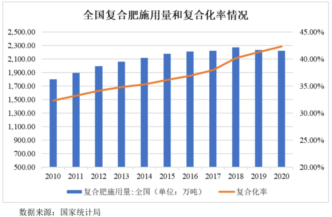 粮食安全一直是我国重点关注的问题。2021年,我国粮食产量达到13,657亿斤,实现了粮食产量的“十八连丰”。但同时2021年我国进口粮食16,453.9万吨,我国粮食对外依存度为19.4%,我国粮食刚性需求巨大且增长迅速,导致我国粮食供需关系仍处于紧平衡状态。从未来发展趋势看,受人口、耕地、水资源、气候、能源、国际市场等因素变化影响,我国粮食安全将长期面临严峻的挑战。化肥作为粮食的粮食,对提高粮食单产及总产均有较大的贡献度,对保障我国粮食安全具有重要的作用。化肥作为基础肥料,存在刚性需求,在提高粮食产量方面仍将持续发挥作用,这对化肥的需求构成了有力保障。(3)复合化率进一步提高