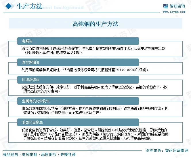 高纯铟是以电解、化学清洗及真空蒸馏等工艺提纯的银白色金属材料。其纯度达到5N(99.999%)至7N8(99.999998%)级别,具备优异延展性和导电性,表面形成氧化膜后可保持稳定特性。主要应用于制备磷化铟(InP)、锑化铟(InSb)等III-V族半导体化合物,以及ITO靶材、高纯合金等材料。目前,高纯铟的生产方法主要有电解法、真空蒸馏法、区域熔炼法、金属有机化合物法、低卤化合物法等。