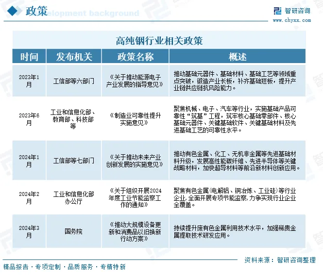 在现代科技高速发展的背景下,半导体、电子等行业对基础材料的需求持续攀升。高纯铟凭借其独特的物理和化学性质,在半导体制造、光电器件、新能源等领域发挥着至关重要的作用。近年来,政府加大对新材料研发和支持力度,为高纯铟行业的发展提供了政策保障。如2023年1月发布的《关于推动能源电子产业发展的指导意见》中,提出推动基础元器件、基础材料、基础工艺等领域重点突破,锻造产业长板,补齐基础短板,提升产业链供应链抗风险能力。2024年1月发布的《关于推动未来产业创新发展的实施意见》中,推动有色金属、化工、无机非金属等先进基础材料升级,发展高性能碳纤维、先进半导体等关键战略材料,加快超导材料等前沿新材料创新应用。