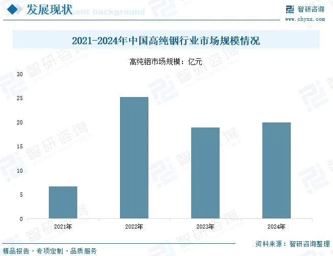 近年来,中国高纯铟行业得到快速发展,成为半导体材料、光伏产业以及电子器件制造等领域的重要支撑。数据显示,2021-2022年中国高纯铟行业市场规模呈现上升趋势,但2023年半导体市场进入深度去库存周期,叠加消费电子市场持续低迷,导致高纯铟需求下滑,市场规模同比下降25%;随后2024年高纯铟行业市场需求逐渐恢复,市场规模达到20亿元,同比上涨6%。预计未来在高端制造和新能源产业持续扩张的带动下,高纯铟行业市场规模将继续保持增长趋势。特别是在半导体材料领域,随着5G通信、人工智能和数据中心建设的加速推进,对高纯铟的依赖程度进一步加深。