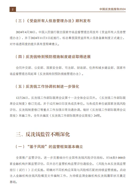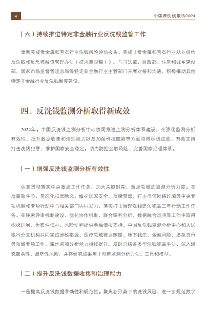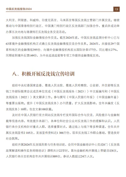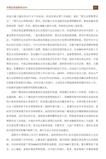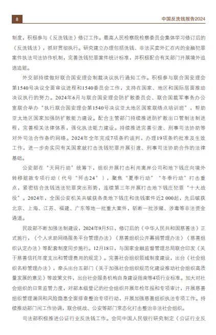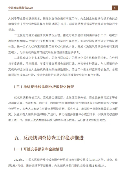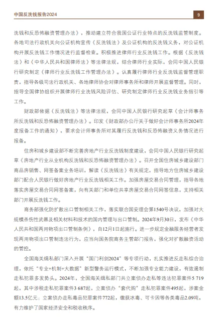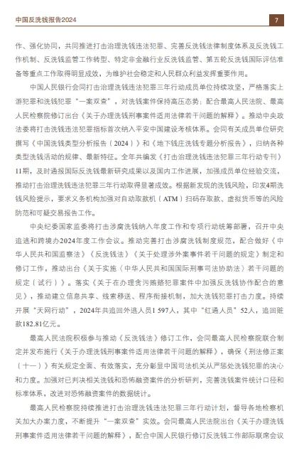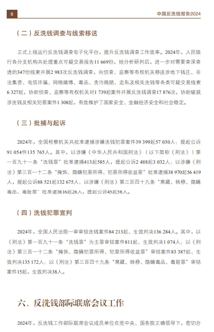 1月27日,中国人民银行发布《2024年中国反洗钱报告》。《报告》显示,中国2024年反洗钱工作围绕第五轮国际评估迎评准备、制度建设、监管深化、监测分析、调查协查、国际合作及宣传培训七大核心领域展开。2024年,中国人民银行反洗钱监测分析系统接收可疑交易报告374.3万份,排查、处理353.4万份,报告处理率不断提升,向执纪执法部门提供金融情报32503批次。正式上线运行反洗钱调查电子化平台,提升反洗钱调查工作效率。2024年,人民银行各分支机构共处理重点可疑交易报告11669份,经分析研判后,进一步对需要查深查透的347份线索开展2983次反洗钱调查,向侦查、监察等有权机关移送涉地下钱庄、非法集资、电信诈骗、网络赌博、毒品、贪污贿赂、走私及相关洗钱等各类可疑交易线索6327起,协助侦查、监察等有权机关对1739起案件开展反洗钱调查17876次,协助破获涉洗钱及相关犯罪案件1308起,有效维护了国家安全、金融经济安全和社会稳定。2024年,全国检察机关共批准逮捕涉嫌洗钱犯罪案件39399起57030人;提起公诉91054件135765人。其中,以涉嫌《中华人民共和国刑法》(以下简称《刑法》)第一百九十一条“洗钱罪”批准逮捕413起585人,提起公诉2488起3032人;以涉嫌《刑法》第三百一十二条“掩饰、隐瞒犯罪所得、犯罪所得收益罪”批准逮捕38970起56419人,提起公诉88521起132675人;以涉嫌《刑法》第三百四十九条“窝藏、转移、隐瞒毒品、毒赃罪”批准逮捕16起26人,提起公诉45起58人。温馨提示:由于微信修改了推送规则,需读者经常留言或点“在看”“点赞”,否则会逐渐收不到推文!如果你还想每天看到我们的文章,请将支付界设为星标或每次看完后点击一下页面下端的“在看”“点赞”,谢谢大家。