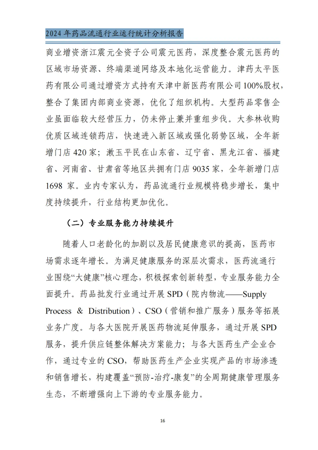 政策推动下,并购重组加速,中小批发企业向专业细分领域转型,零售药店连锁化率进一步提高。所有制结构中国有及国有控股企业占比超六成,混合所有制改革与资源整合成为热点。(二)专业服务与健康功能拓展