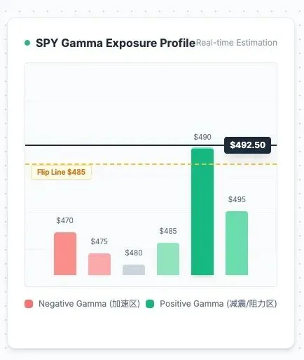 在这个高维战场,普通散户看财报、看K线,就像拿着长矛去打机关枪。你需要升级装备。AlphaGBM 的核心技术底座,就是为了解决这个问题而生的。我们不看表面的热闹,我们通过计算全市场的期权流,为你构建上帝视角:Gamma Exposure (GEX)。我们把复杂的金融工程,通过可视化(Visualization)技术,变成了两盏灯:GEX 翻转线(The Flip Line):市场的“红绿灯”股价在线上(正 Gamma 区):市场处于“减震模式”。做市商在“低吸高抛”,股价会很稳。这时候,任何大跌都是假摔,是上车的机会。股价在线下(负 Gamma 区):市场处于“加速模式”。做市商在“追涨杀跌”。这时候,任何风吹草动都会引发雪崩。实战价值:如果财报发布时,股价跌破了翻转线,跑!不要犹豫!因为做市商的抛售飞轮已经启动了。Gamma 墙(Gamma Walls):看不见的“鬼打墙”你有没有遇到过这种情况:股价涨到某个整数位,比如 $200,怎么都突不破,明明利好不断,就是不涨?在 AlphaGBM 的图表上,你会看到 $200 这个位置有一根巨大的绿色柱子。这代表这里聚集了巨量的正 Gamma。在这里,做市商会疯狂地反向操作,把股价死死地“钉”(Pinning Effect)在这个位置。如果你看不见这堵墙,在 $199 追高买入,那你就是在给做市商送钱。4