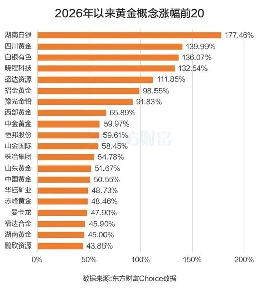 黄金概念的涨势已从“单点爆发”转向“全面开花”。2026年开年至今,板块内多只个股股价实现翻倍,湖南白银以177.46%的涨幅高居榜首,四川黄金、白银有色、晓程科技、盛达资源的涨幅也均超过100%。即便是市值超千亿的大盘股,也展现出强劲动能——紫金矿业早盘一度涨超6%,总市值突破1.1万亿元;中金黄金涨5.2%,股价创2015年以来新高。