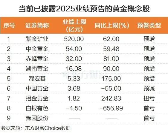 黄金概念股的强势并非“空中楼阁”,业绩预告的亮眼表现为股价提供了坚实支撑。东方财富Choice数据显示,目前已有9家黄金概念股披露2025年业绩预告,其中5股预增、1股扭亏,盈利面超六成。
