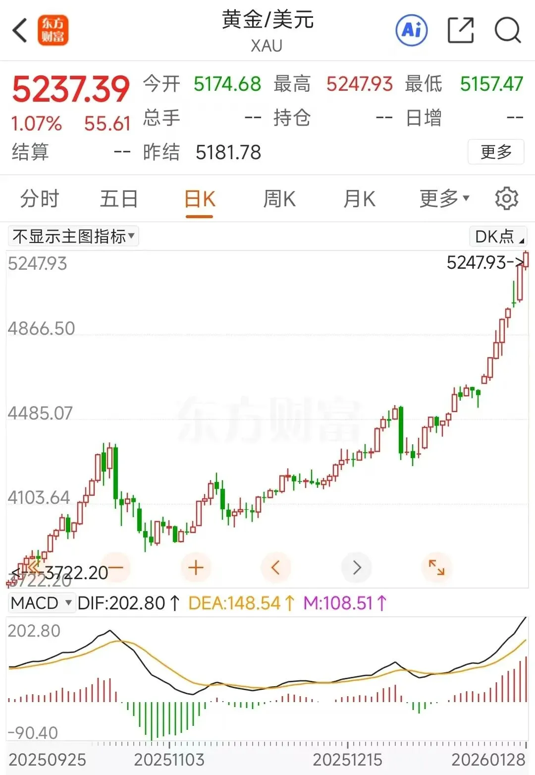 1月28日早盘,黄金概念股延续强势表现,成为A股市场最耀眼的板块。截至上午收盘,晓程科技、白银有色、中国黄金、莱绅通灵等20只个股集体涨停,曼卡龙、迪阿股份等多股涨幅超10%,板块整体涨幅达5.3%,远超同期沪指0.8%的涨幅。这波行情的背后,是国际金价的持续狂飙——现货黄金今日盘中突破5200美元/盎司,较2025年末上涨超900美元,不到一个月涨幅超21%,强势表现点燃了资本市场对黄金产业链的热情。
