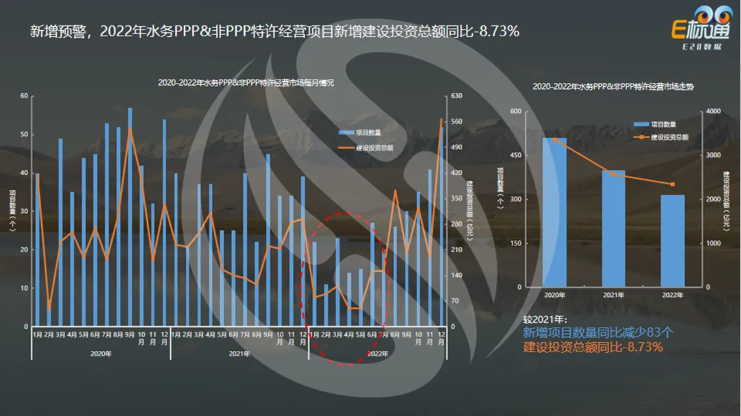 水务PPP和非PPP特许经营新增项目持续减少(右图),2022年水务PPP和非PPP特许经营项目新增较2021年同期减少83个,建设投资总额同比减少8.73%。具体看,在2022年上半年是低洼区域(左图红圈),和2022年上半年新冠疫情严重有密不可分的关系,下半年水务新增项目释放有所缓解,但全年新增仍不及2021年。