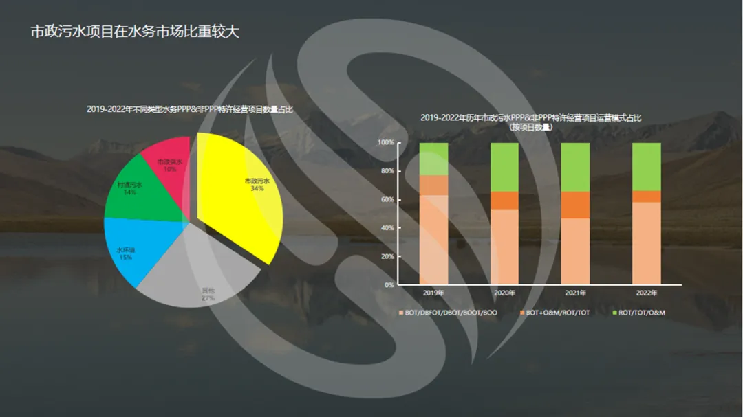 (4)在水务市场,市政污水这一细分领域所释放的项目数量占比最大,带有BOTDBFOTDBOT/BOOT/BOO等新建属性的项目占比从2019年到2021年有下降,2022年略有一点反弹,而带存量属性的新增项目占比逐渐增大。