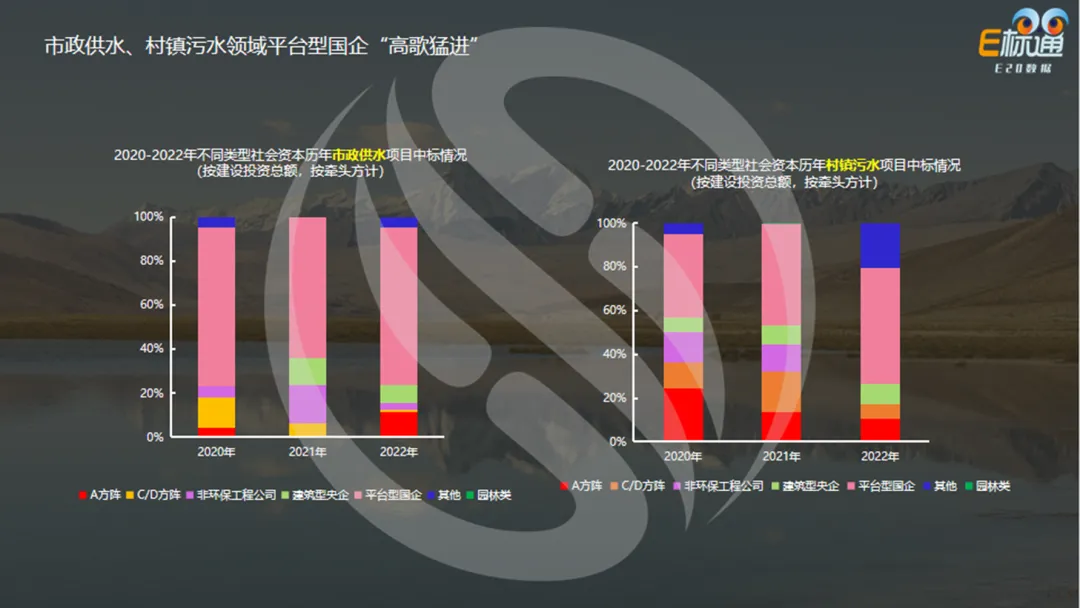 右图是为2020-2022年不同类型社会资本水环境PPP&非PPP特许经营项目中标情况,平台型国企和建筑型央企旗鼓相当。