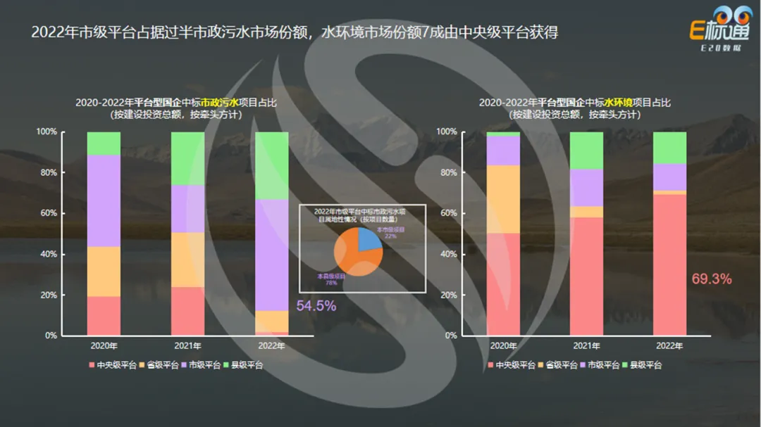 右图是水环境领域平台型国企的中标情况,(近三年)每年所占水环境市场份额最大的为中央级国企,2022年占(平台型国企占水环境占比的)69.3%。