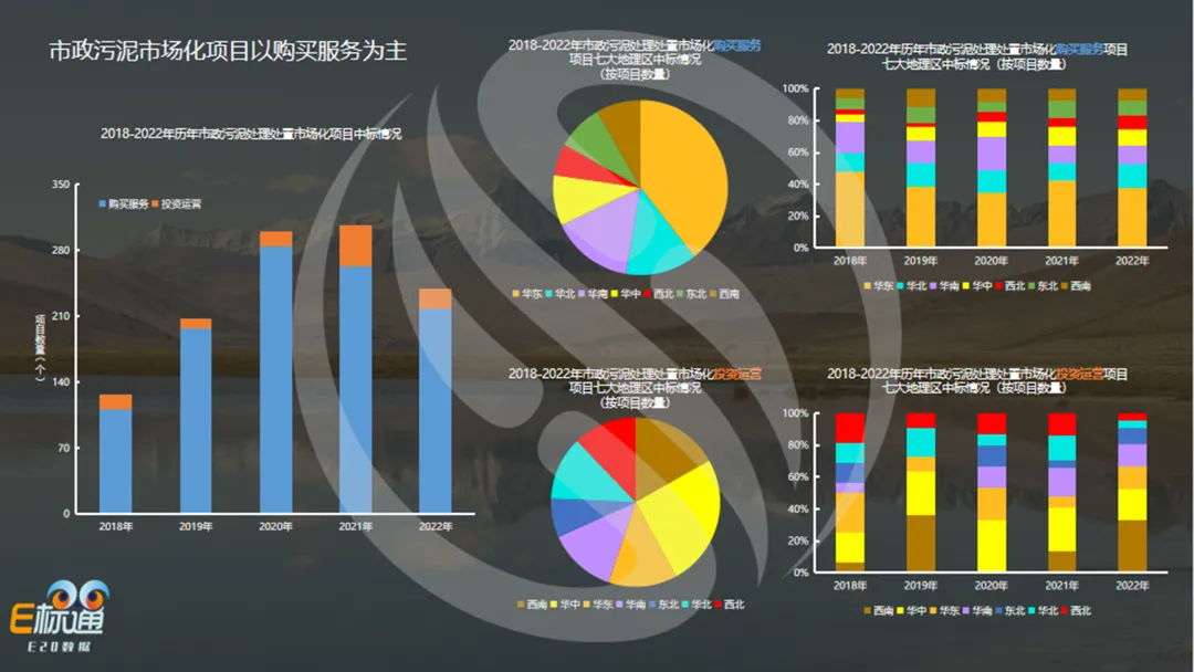 市政污泥市场化项目主要以购买服务为主(左图)。右侧四个图分别是购买服务和投资运营类市场化污泥项目的地理区分布整体情况和历年情况。购买服务类市政污泥市场化项目释放区域主要集中在华东地区,投资运营类市政污泥市场化项目七大地理区较为均分,但每年释放区域有所不同。