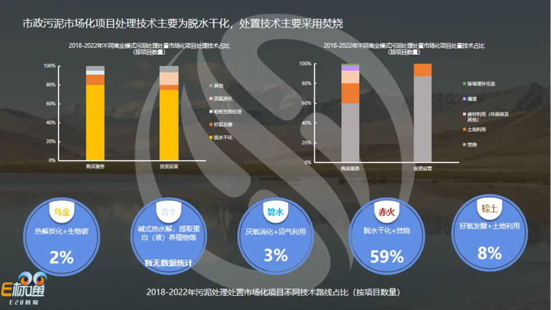 市政污泥的处置技术以焚烧为主(右上图),不同商业模式的项目所采用的处置技术也是不同的。