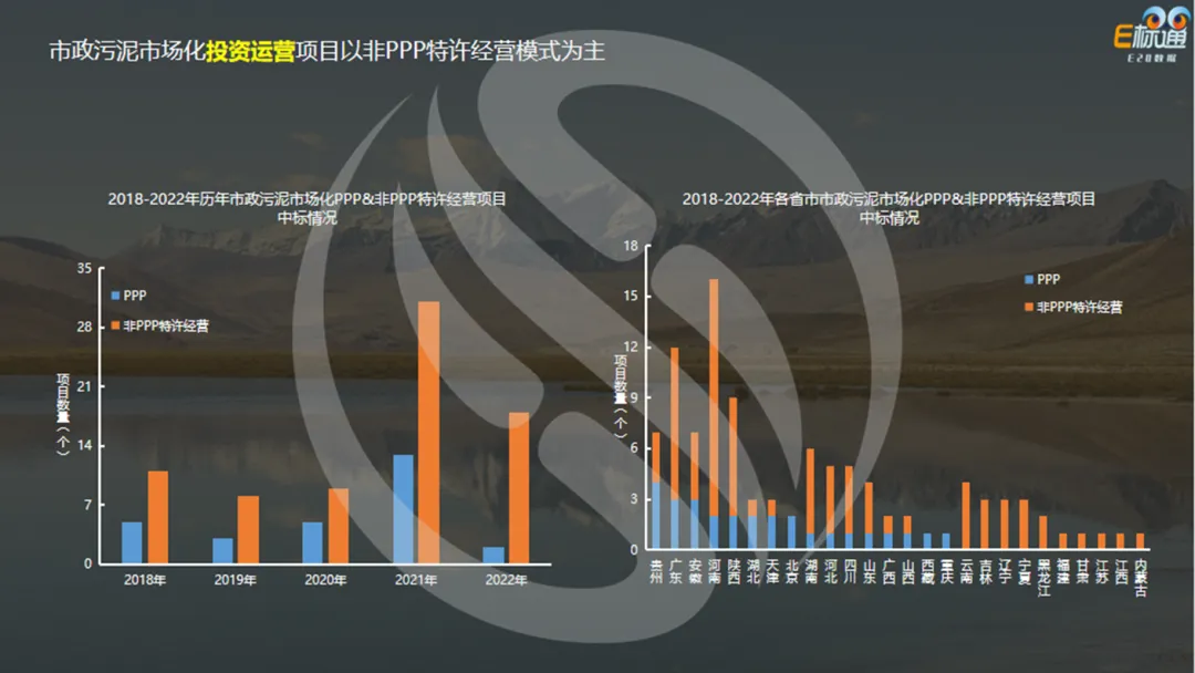聚焦市政污泥市场化PPP&非PPP特许经营项目中标情况。左图,项目主要以非PPP特许经营模式为主,以PPP模式中标的项目占比较小。右图是2018—2022年市政污泥市场化投资运营项目各省市中标情况,PPP项目中标数量排名前三的省份分别为:贵州省、广东省和安徽省。