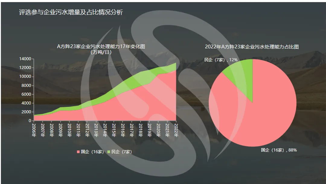 评选参与的23家A方阵中,7家为民企,16家为国企。评选参与企业污水增量和占比情况分析,国进民退依然无实质性改变(左图);国企污水处理能力占比为80%,民企仅为20%(右图)。