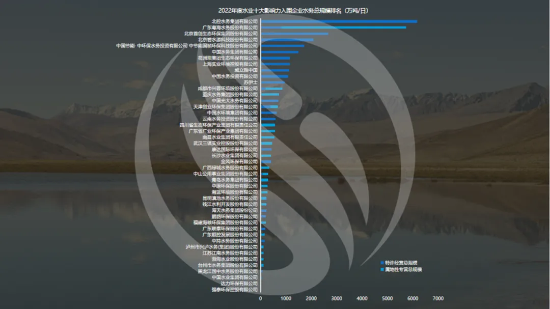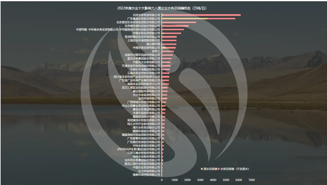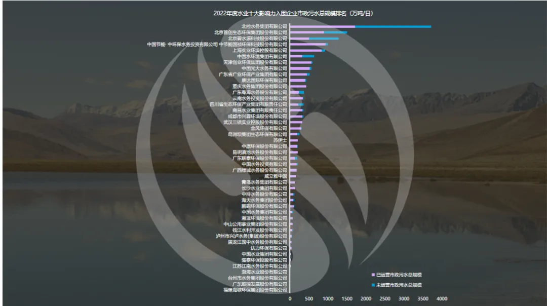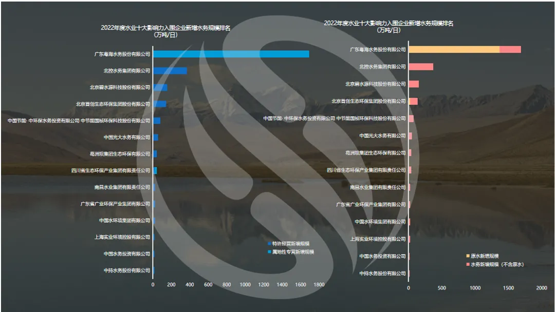 2022年污水市场化集中度为53%,和2021年一样。以下是2022年水业十大影响力入围企业水务总规模、新增规模以及市政污水总规模排名。