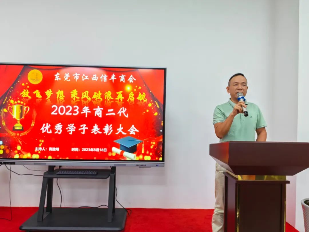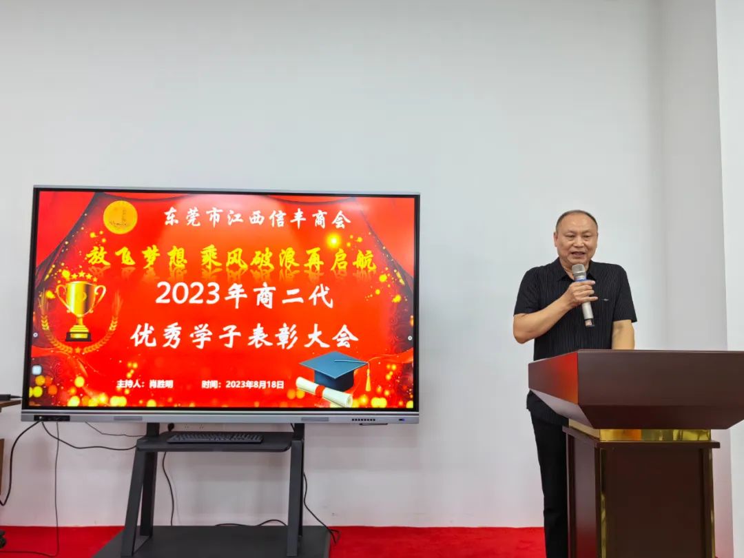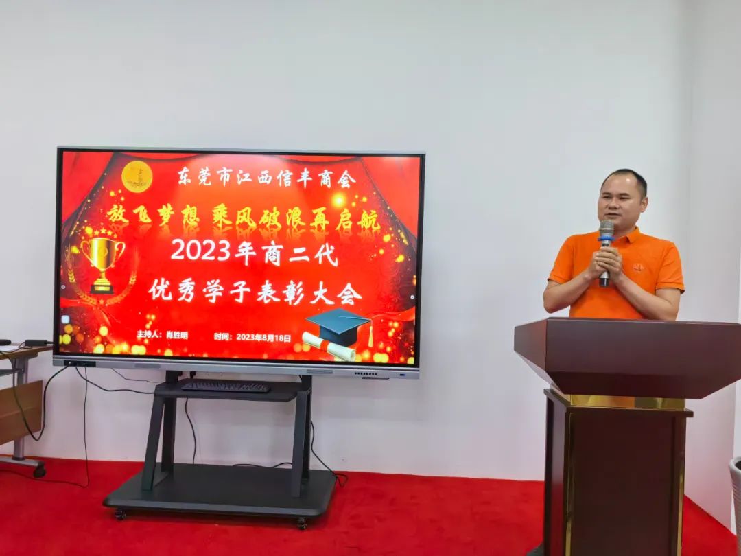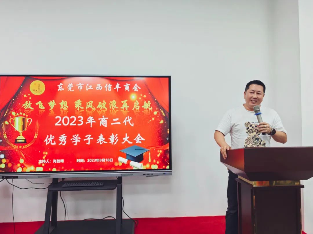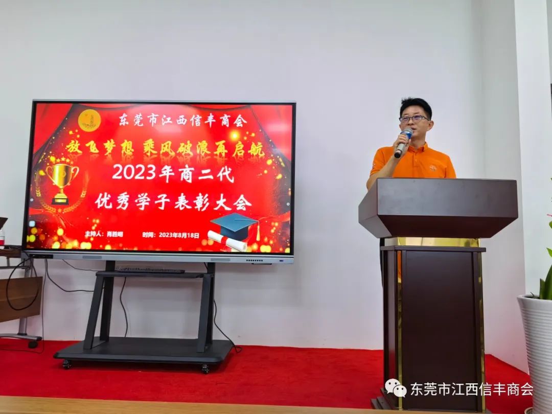 “放飞梦想 乘风破浪再启航”东莞市江西信丰商会在商会会议室举行2023年金榜题名学子表彰仪式。为优秀的信商二代高考生颁发荣誉证书及奖学金。东莞市江西信丰商会会长王诚伟,终身荣誉会长卢德光,执行会长陈厚敏、吕秋明、刘世文,监事长刘飞,秘书长肖胜明,常务副会长谢建民、黄春裕、王家玲、李晓城、丁家辉、黄际斌、副会长谢昌富、何建平、钟初平,会员刘翠桑及受表彰学子及其家长近40人参加了此次活动。活动由秘书长肖胜明主持。