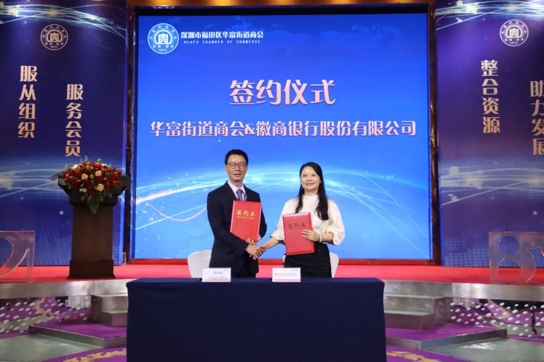 活动现场,彭锦环会长代表华富街道商会与微商银行股份有限公司签署战略合作协议,通过紧密合作,双方将加强资源整合,共同开展项目合作,并致力于为会员提供更优质的服务和支持。
