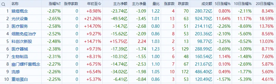 光伏设备:板块跌幅居前,阳光电源跌超3%。